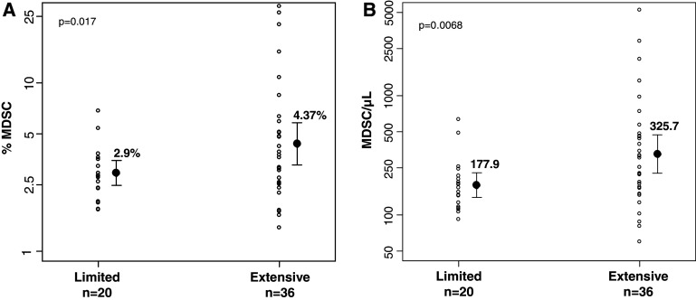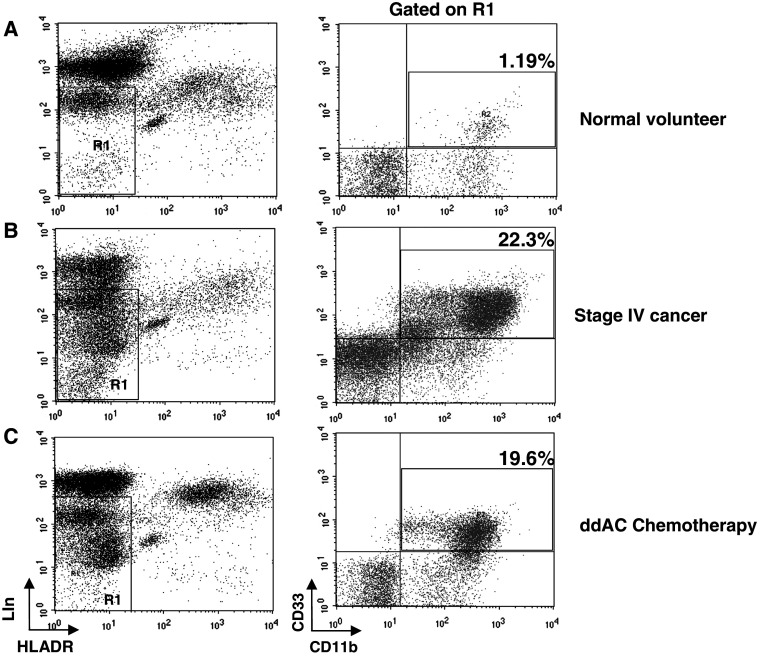 Abnormal accumulation of myeloid-derived suppressor cells (MDSC) is an important mechanism of tumor immune evasion. Cyclophosphamide (CTX) has also been shown in non-tumor bearing animals to cause transient surges in MDSC. Knowledge of MDSC is primarily based on preclinical work, and to date only few published studies have involved cancer patients. The goal of this study was to test the hypothesis that circulating MDSC levels correlate with clinical cancer stage, CTX-based chemotherapy, and metastatic tumor burden. Whole blood was collected from 106 newly diagnosed solid tumor patients (stages I-IV). Percentages of circulating MDSC (Lin(-/Lo), HLA DR-, CD33(+)CD11b(+)) were determined prior to initiation of systemic therapy. In 17 early stage breast cancer patients receiving doxorubicin-cyclophosphamide chemotherapy every 14 days (ddAC) blood was collected on day 1 of each cycle. Circulating MDSC were significantly increased in cancer patients of all stages relative to healthy volunteers. A significant correlation between circulating MDSC and clinical cancer stage was also observed. Moreover, among stage IV patients, those with extensive metastatic tumor burden had the highest percent and absolute number of MDSC. Significant increases in circulating MDSC were observed with ddAC when compared with pretreatment levels. Circulating MDSC levels correlate with clinical cancer stage, ddAC, and metastatic tumor burden. This information must be incorporated into the design of future trials exploring immune-based therapeutic strategies. Pharmacologic modulation of MDSC should also be tested in future clinical trials.