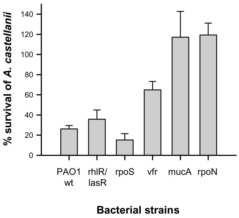 Bacteria and protozoa coexist in a wide range of biofilm communities of natural, technical and medical importance. Generally, this interaction is characterized by the extensive grazing activity of protozoa on bacterial prey populations. We hypothesized that the close spatial coexistence in biofilms should allow opportunistic pathogenic bacteria to utilize their eukaryote-targeting arsenal to attack and exploit protozoan host cells. Studying cocultures of the environmental pathogen Pseudomonas aeruginosa and the amoeba Acanthamoeba castellanii, we found that P. aeruginosa rapidly colonized and killed biofilm-associated amoebae by a quorum-sensing independent mechanism. Analysis of the amoeba-induced transcriptome indicated the involvement of the P. aeruginosa type III secretion system (T3SS) in this interaction. A comparison of mutants with specific defects in the T3SS demonstrated the use of the secretion apparatus and the effectors ExoU, ExoS and ExoT in the killing process, of which ExoU had the greatest impact. T3SS-mediated virulence towards A. castellanii was found to be controlled by the global regulators RpoN and RpoS and through modulation of cAMP and alginate biosynthesis. Our findings suggest that conserved virulence pathways and specifically the T3SS play a central role in bacteria-protozoa interactions in biofilms and may be instrumental for the environmental persistence and evolution of opportunistic bacterial pathogens.