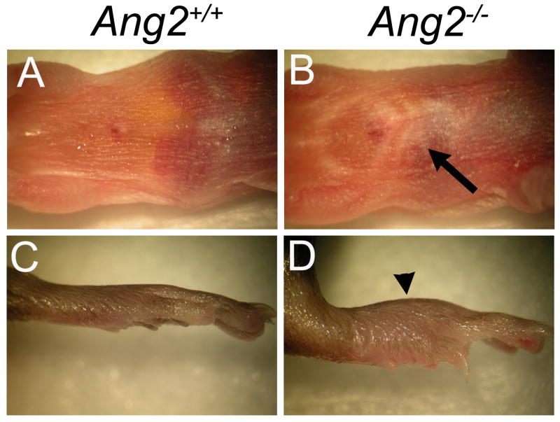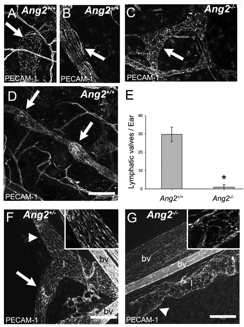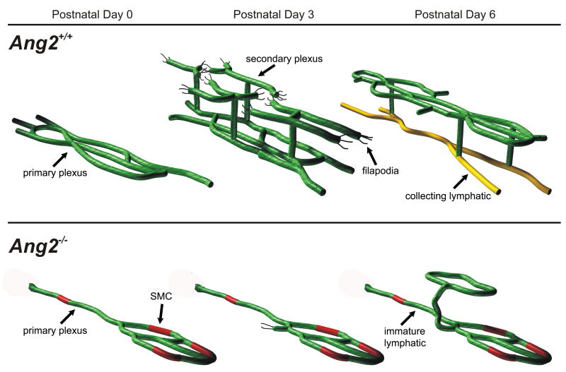 Molecular mechanisms regulating the remodeling of the lymphatic vasculature from an immature plexus of vessels to a hierarchal network of initial and collecting lymphatics are not well understood. One gene thought to be important for this process is Angiopoietin-2 (Ang-2). Ang2(-/-) mice have previously been reported to exhibit an abnormal lymphatic phenotype but the precise nature of the lymphatic defects and the underlying mechanisms have yet to be defined. Here we demonstrate by whole-mount immunofluorescence staining of ear skin and mesentery that lymphatic vessels in Ang2(-/-) mice fail to mature and do not exhibit a collecting vessel phenotype. Furthermore, dermal lymphatic vessels in Ang2(-/-) pups prematurely recruit smooth muscle cells and do not undergo proper postnatal remodeling. In contrast, Ang2 knock-out Ang1 knock-in mice do develop a hierarchal lymphatic vasculature, suggesting that activation of Tie-2 is required for normal lymphatic development. Taken together, this work pinpoints a specific lymphatic defect of Ang2(-/-) mice and further defines the sequential steps in lymphatic vessel remodeling.