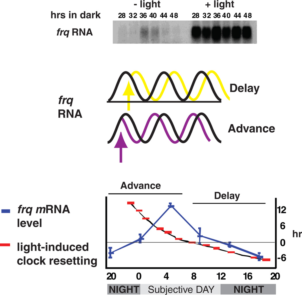 Neurospora has proven to be a tractable model system for understanding the molecular bases of circadian rhythms in eukaryotes. At the core of the circadian oscillatory system is a negative feedback loop in which two transcription factors, WC-1 and WC-2, act together to drive expression of the frq gene. WC-2 enters the promoter region of frq coincident with increases in frq expression and then exits when the cycle of transcription is over, whereas WC-1 can always be found there. FRQ promotes the phosphorylation of the WCs, thereby decreasing their activity, and phosphorylation of FRQ then leads to its turnover, allowing the cycle to reinitiate. By understanding the action of light and temperature on frq and FRQ expression, the molecular basis of circadian entrainment to environmental light and temperature cues can be understood, and recently a specific role for casein kinase 2 has been found in the mechanism underlying circadian temperature-compensation. These data promise molecular explanations for all of the canonical circadian properties of this model system, providing biochemical answers and regulatory logic that may be extended to more complex eukaryotes including humans.