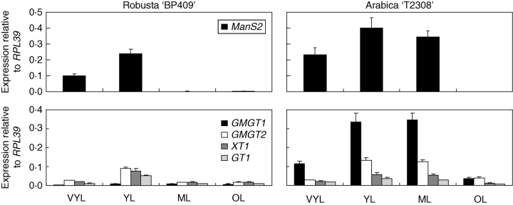 Key results: Two of the putative galactomannan biosynthetic genes, ManS1 and GMGT1, were demonstrated to have very high expression in the developing coffee grain of both Coffea species during endosperm development, consistent with our proposal that these two genes are responsible for the production of the majority of the galactomannans found in the grain. In contrast, the expression data presented indicates that the ManS2 gene product is probably involved in the synthesis of the galactomannans found in green tissue.