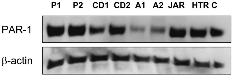 Objective: Preeclampsia (PE) is characterized by excessive thrombin generation, which has been implicated in the multiple organ damage associated with the disease. The biological effects of thrombin on coagulation and inflammation are mediated by protease-activated receptor-1 (PAR-1), a G protein-coupled receptor. The aim of this study was to determine whether preterm PE is associated with changes in placental expression of PAR-1.