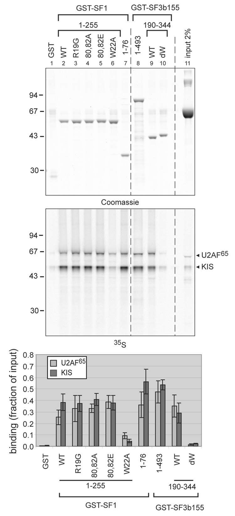 The protein kinase KIS is made by the juxtaposition of a unique kinase domain and a C-terminal domain with a U2AF homology motif (UHM), a sequence motif for protein interaction initially identified in the heterodimeric pre-mRNA splicing factor U2AF. This domain of KIS is closely related to the C-terminal UHM domain of the U2AF large subunit, U2AF(65). KIS phosphorylates the splicing factor SF1, which in turn enhances SF1 binding to U2AF(65) and the 3' splice site, an event known to take place at an early step of spliceosome assembly. Here, the analysis of the subcellular localization of mutated forms of KIS indicates that the kinase domain of KIS is the necessary domain for its nuclear localization. As in the case of U2AF(65), the UHM-containing C-terminal domain of KIS is required for binding to the splicing factors SF1 and SF3b155. The efficiency of KIS binding to SF1 and SF3b155 is similar to that of U2AF(65) in pull-down assays. These results further support the functional link of KIS with splicing factors. Interestingly, when compared to other UHM-containing proteins, KIS presents a different specificity for the UHM docking sites that are present in the N-terminal region of SF3b155, thus providing a new insight into the variety of interactions mediated by UHM domains.