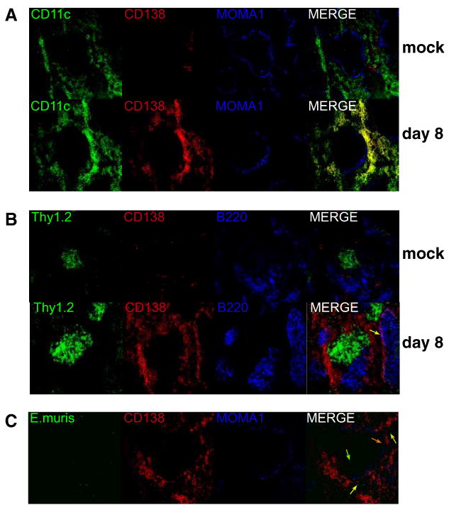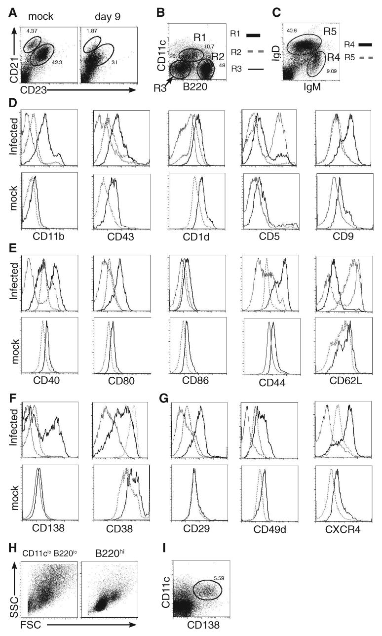 Although T-independent immunity is known to be generated against bacterial capsular and cell wall polysaccharides expressed by a number of bacterial pathogens, it has not been studied in depth during intracellular bacterial infections. Our previous study demonstrated that Ehrlichia muris, an obligate intracellular tick-borne pathogen, generates protective classical TI responses in CD4 T cell-deficient C57BL/6 mice. We found that E. muris T-independent immunity is accompanied by the expansion of a very large extrafollicular spleen population of CD11c(low)-expressing plasmablasts that exhibit characteristics of both B-1 and marginal zone B cells. The plasmablasts comprised up to 15% of the total spleen lymphocytes and approximately 70% of total spleen IgM(high)IgD(low) cells during peak infection in both wild-type and MHC class II-deficient mice. The CD11c(low) cells exhibited low surface expression of B220, CD19, and CD1d, high expression of CD11b, CD43, but did not express CD5. Approximately 50% of the CD11c(low) cells also expressed CD138. In addition to CD11b and CD11c, the plasmablasts expressed the beta(1) (CD29) and alpha4 (CD49d) integrins, as well as the chemokine receptor CXCR4, molecules which may play roles in localizing the B cells extrafollicular region of the spleen. During peak infection, the CD11c(low) cells accounted for the majority of the IgM-producing splenic B cells and nearly all of the E. muris outer membrane protein-specific IgM-secreting cells. Thus, during this intracellular bacterial infection, CD11c expression identifies a population of Ag-specific spleen plasmablasts responsible for T-independent Ab production.