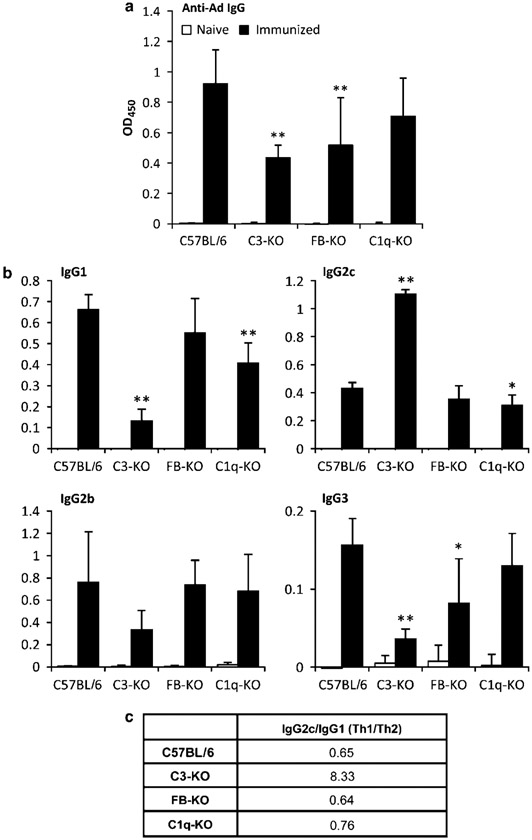 The complement system is known to play critical roles in pathogen identification, initiation of innate immune responses and facilitation of adaptive immune responses. Several studies have suggested that recombinant adenoviruses (rAds) interact with proteins of the complement system within minutes of administration. In this study, we assessed the roles of the alternative (Factor B), classical (C1q and C4) and common (C3) arms of the complement system in the innate and humoral response to systemic rAd administration using mice genetically deficient for each of these functions. Although most plasma cytokines and chemokines induced by Ads appeared to be elicited in a C3-dependent manner, we found that rAd-induced thrombocytopenia was dependent on Factor B and C3, implicating the alternative pathway as responsible for this response. Alteration of the complement-dependent transcriptome response after rAd-induced liver gene expression was also found to be Factor B- and C3-dependent. Ad interactions with the classical and alternative arms of the complement system can also be redundant, as many complement-dependent, Ad-induced innate immune responses appeared to be primarily C3-dependent. We also identified a C3 dependence of Ad-mediated induction of the nuclear factor-kappaB (NF-kappaB) activation pathway. Finally, we confirmed that humoral immune responses to the vector capsid, and the transgene it encodes, are also complement-dependent.