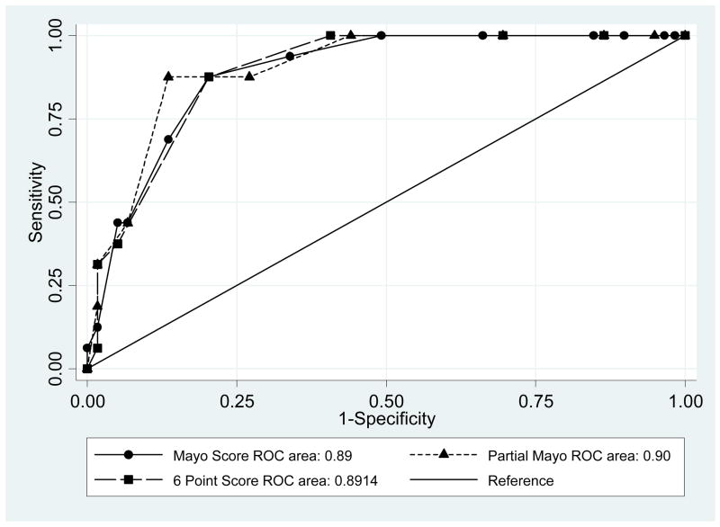 Results: Each index was strongly correlated with the patient's rating of disease activity at week 12 (Spearman correlations 0.61-0.71, P < 0.0001 for all correlations). The maximal product of sensitivity and specificity to identify patient reported improvement of disease activity was achieved using cutpoints for change of 2.5 for the Mayo score (sensitivity 88%, specificity 80%), 2.5 for the partial Mayo score (sensitivity 88%, specificity 87%), and 1.5 for the 6-point score (sensitivity 88%, specificity 80%).