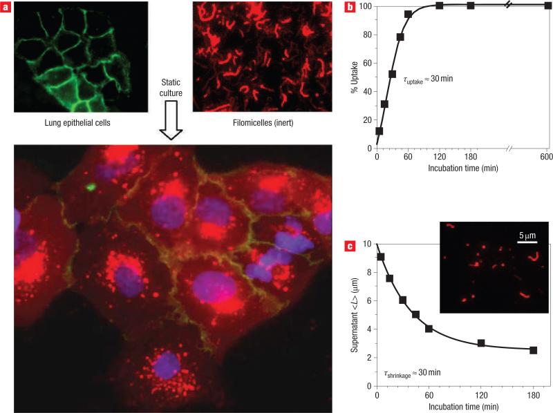 Interaction of spherical particles with cells and within animals has been studied extensively, but the effects of shape have received little attention. Here we use highly stable, polymer micelle assemblies known as filomicelles to compare the transport and trafficking of flexible filaments with spheres of similar chemistry. In rodents, filomicelles persisted in the circulation up to one week after intravenous injection. This is about ten times longer than their spherical counterparts and is more persistent than any known synthetic nanoparticle. Under fluid flow conditions, spheres and short filomicelles are taken up by cells more readily than longer filaments because the latter are extended by the flow. Preliminary results further demonstrate that filomicelles can effectively deliver the anticancer drug paclitaxel and shrink human-derived tumours in mice. Although these findings show that long-circulating vehicles need not be nanospheres, they also lend insight into possible shape effects of natural filamentous viruses.