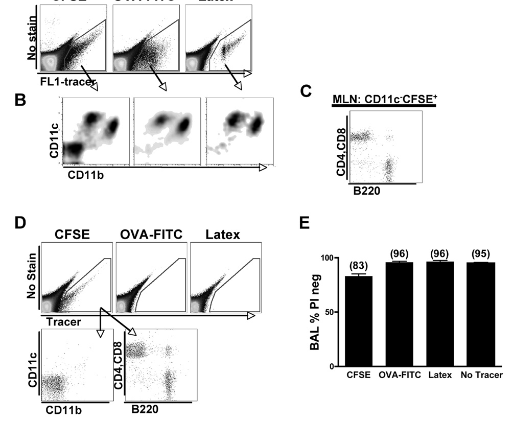 Dendritic cell migration from the airway to lymph nodes is a key event in the development of airway immunity during infection, allergy, and vaccination. To identify the best approaches to investigate DC migration to lung-draining lymph nodes, we directly compared three methods previously used to track DC migration: airway administration of fluorescent OVA, latex beads, or carboxyfluorescein succinimidyl ester (CFSE). We show that two of the methods employed in optimal conditions-administration of fluorescent OVA or latex particles-have broadly relevant utility in studies of pulmonary DC migration, both in the presence and absence of inflammatory mediators. However, CFSE was of limited value because it induced a robust airway inflammatory response upon instillation. Unexpectedly, antigen-loaded tracers with distinct physical properties differently affected the populations that acquired the tracers and the overall T cell response. Specifically, soluble OVA and OVA formulated as a particulate after conjugation to latex beads were acquired in different proportions in vivo by the two characterized subsets of pulmonary DCs: CD11b(hi)CD103(-) and CD11b(lo)CD103(+)langerin(+) DC populations. Consequently, and in line with recent studies that these two subsets of DCs respectively activate CD4(+) and CD8(+) lymphocyte populations, the physical nature of the antigen delivery vehicle strongly influenced the degree of CD4(+) versus CD8(+) OVA-specific T cell activation. This finding suggests that changes in the physical presentation of the same antigen delivered to the airway during natural immune responses or vaccinations may markedly affect the character of the T cell response that ensues.