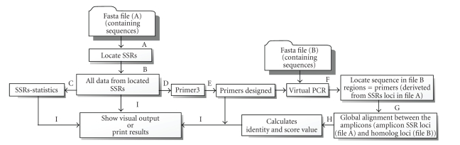 Microsatellites or SSRs (simple sequence repeats) are ubiquitous short tandem duplications occurring in eukaryotic organisms. These sequences are among the best marker technologies applied in plant genetics and breeding. The abundant genomic, BAC, and EST sequences available in databases allow the survey regarding presence and location of SSR loci. Additional information concerning primer sequences is also the target of plant geneticists and breeders. In this paper, we describe a utility that integrates SSR searches, frequency of occurrence of motifs and arrangements, primer design, and PCR simulation against other databases. This simulation allows the performance of global alignments and identity and homology searches between different amplified sequences, that is, amplicons. In order to validate the tool functions, SSR discovery searches were performed in a database containing 28 469 nonredundant rice cDNA sequences.