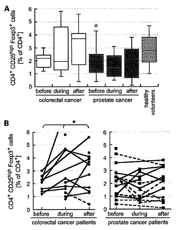 Experimental design: Lymphocytes were isolated from colorectal cancer (CRC) patients before, during, and after presurgical chemoradiotherapy. Similar samples were taken from prostate cancer patients receiving standard RT. The level of CD8(+) T cells capable of binding tetramers for the tumor-associated antigen survivin, which is overexpressed in both cancer types, was enumerated in HLA-A*0201 patient samples. CD4(+), CD25(high), Foxp3(+) cells were also enumerated to evaluate therapy-induced changes in T(regulatory) cells. For CRC patients, most of whom were enrolled in a clinical trial, pathologic response data were available, as well as biopsy and resection specimens, which were stained for cytoplasmic and intranuclear survivin.