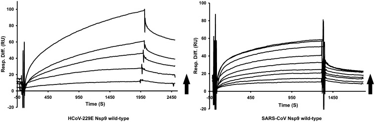 Non-structural protein 9 (Nsp9) of coronaviruses is believed to bind single-stranded RNA in the viral replication complex. The crystal structure of Nsp9 of human coronavirus (HCoV) 229E reveals a novel disulfide-linked homodimer, which is very different from the previously reported Nsp9 dimer of SARS coronavirus. In contrast, the structure of the Cys69Ala mutant of HCoV-229E Nsp9 shows the same dimer organization as the SARS-CoV protein. In the crystal, the wild-type HCoV-229E protein forms a trimer of dimers, whereas the mutant and SARS-CoV Nsp9 are organized in rod-like polymers. Chemical cross-linking suggests similar modes of aggregation in solution. In zone-interference gel electrophoresis assays and surface plasmon resonance experiments, the HCoV-229E wild-type protein is found to bind oligonucleotides with relatively high affinity, whereas binding by the Cys69Ala and Cys69Ser mutants is observed only for the longest oligonucleotides. The corresponding mutations in SARS-CoV Nsp9 do not hamper nucleic acid binding. From the crystal structures, a model for single-stranded RNA binding by Nsp9 is deduced. We propose that both forms of the Nsp9 dimer are biologically relevant; the occurrence of the disulfide-bonded form may be correlated with oxidative stress induced in the host cell by the viral infection.