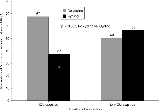 Results: During the four years prior to cycling, 543 infections with gram-positive organisms were acquired in the ICU (45.3/1,000 patient-days), including 105 caused by MRSA (8.8/1,000 patient days) and 21 by VRE (1.8/1,000 patient-days). In the two years after implementation of cycling, 169 gram-positive infections were documented (28.1/1,000 patient-days; p < 0.0001 vs. non-cycling period), including 11 caused by MRSA (1.8/1,000 patient-days; p < 0.0001 vs. non-cycling period). The percentage of S. aureus infections caused by MRSA declined from 67% to 36%. The rate of infection with VRE was unchanged. Outside the ICU, the yearly numbers of infections with both MRSA and VRE increased over time.