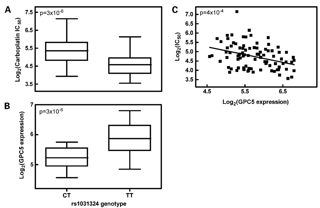 To gain a better understanding of the genetic variants associated with carboplatin-induced cytotoxicity in individuals of African descent, we present a step-wise approach integrating genotypes, gene expression, and sensitivity of HapMap cell lines to carboplatin. Cell lines derived from 30 trios of African descent (YRI) were used to develop a preclinical model to identify genetic variants and gene expression that contribute to carboplatin-induced cytotoxicity. Cytotoxicity was determined as cell growth inhibition at increasing concentrations of carboplatin for 72 h. Gene expression of 89 HapMap YRI cell lines was determined using the Affymetrix GeneChip Human Exon 1.0 ST Array. Single nucleotide polymorphism genotype and the percent survival at different treatment concentrations along with carboplatin IC50 were linked through whole genome association. A second association test was done between single nucleotide polymorphism genotype and gene expression, and linear regression was then used to capture those genes whose expression correlated to drug sensitivity phenotypes. This approach allows us to identify genetic variants that significantly associate with sensitivity to the cytotoxic effects of carboplatin through their effect on gene expression. We found a gene (GPC5) whose expression is important in all carboplatin treatment concentrations as well as many genes unique to either low (e.g., MAPK1) or high (e.g., BRAF, MYC, and BCL2L1) concentrations of drug. Our whole genome approach enables us to evaluate the contribution of genetic and gene expression variation to a wide range of cellular phenotypes. The identification of concentration specific genetic signatures allows for potential integration of pharmacokinetics, pharmacodynamics, and pharmacogenetics in tailoring chemotherapy.