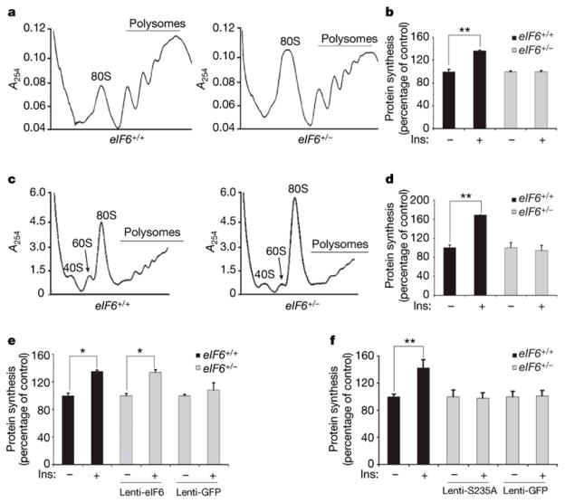 Cell growth and proliferation require coordinated ribosomal biogenesis and translation. Eukaryotic initiation factors (eIFs) control translation at the rate-limiting step of initiation. So far, only two eIFs connect extracellular stimuli to global translation rates: eIF4E acts in the eIF4F complex and regulates binding of capped messenger RNA to 40S subunits, downstream of growth factors, and eIF2 controls loading of the ternary complex on the 40S subunit and is inhibited on stress stimuli. No eIFs have been found to link extracellular stimuli to the activity of the large 60S ribosomal subunit. eIF6 binds 60S ribosomes precluding ribosome joining in vitro. However, studies in yeasts showed that eIF6 is required for ribosome biogenesis rather than translation. Here we show that mammalian eIF6 is required for efficient initiation of translation, in vivo. eIF6 null embryos are lethal at preimplantation. Heterozygous mice have 50% reduction of eIF6 levels in all tissues, and show reduced mass of hepatic and adipose tissues due to a lower number of cells and to impaired G1/S cell cycle progression. eIF6(+/-) cells retain sufficient nucleolar eIF6 and normal ribosome biogenesis. The liver of eIF6(+/-) mice displays an increase of 80S in polysomal profiles, indicating a defect in initiation of translation. Consistently, isolated hepatocytes have impaired insulin-stimulated translation. Heterozygous mouse embryonic fibroblasts recapitulate the organism phenotype and have normal ribosome biogenesis, reduced insulin-stimulated translation, and delayed G1/S phase progression. Furthermore, eIF6(+/-) cells are resistant to oncogene-induced transformation. Thus, eIF6 is the first eIF associated with the large 60S subunit that regulates translation in response to extracellular signals.