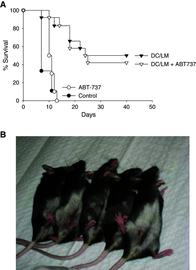 Several tumor immunotherapy approaches result in a low percentage of durable responses in selected cancers. We hypothesized that the insensitivity of cancer cells to immunotherapy may be related to an anti-apoptotic cancer cell milieu, which could be pharmacologically reverted through the inhibition of antiapoptotic Bcl-2 family proteins in cancer cells. ABT-737, a small molecule inhibitor of the antiapoptotic proteins Bcl-2, Bcl-w and Bcl-x(L), was tested for the ability to increase antitumor immune responses in two tumor immunotherapy animal models. The addition of systemic therapy with ABT-737 to the immunization of BALB/c mice with tumor antigen peptide-pulsed dendritic cells (DC) resulted in a significant delay in CT26 murine colon carcinoma tumor growth and improvement in survival. However, the addition of ABT-737 to either a vaccine strategy involving priming with TRP-2 melanoma antigen peptide-pulsed DC and boosting with recombinant Listeria monocytogenes expressing the same melanoma antigen, or the adoptive transfer of TCR transgenic cells, did not result in superior antitumor activity against B16 murine melanoma. In vitro studies failed to demonstrate increased cytotoxic lytic activity when testing the combination of ABT-737 with lymphokine activated killer (LAK) cells, or the death receptor agonists Fas, TRAIL-ligand or TNF-alpha against the CT26 and B16 cell lines. In conclusion, the Bcl-2 inhibitor ABT-737 sensitized cancer cells to the antitumor effect of antigen-specific immunotherapy in a vaccine model for the CT26 colon carcinoma in vivo but not in two immunotherapy strategies against B16 melanoma.