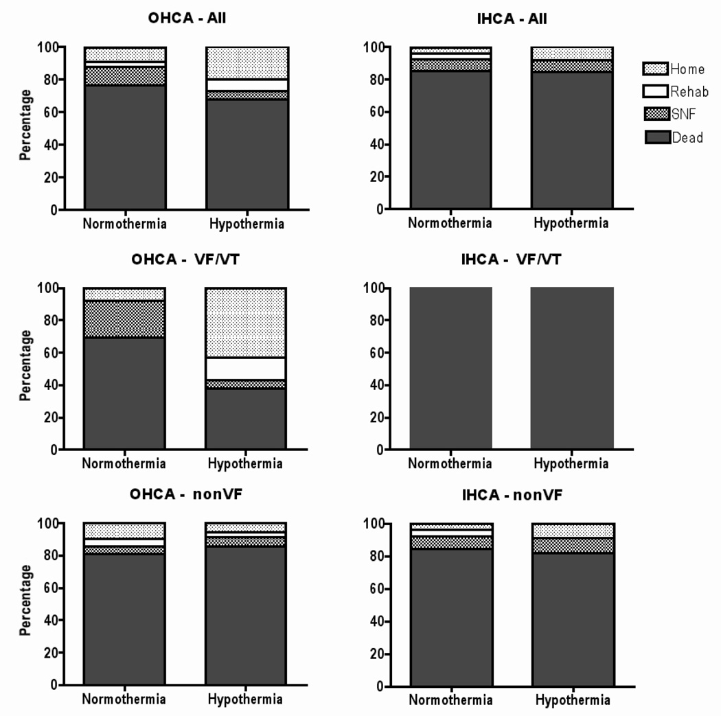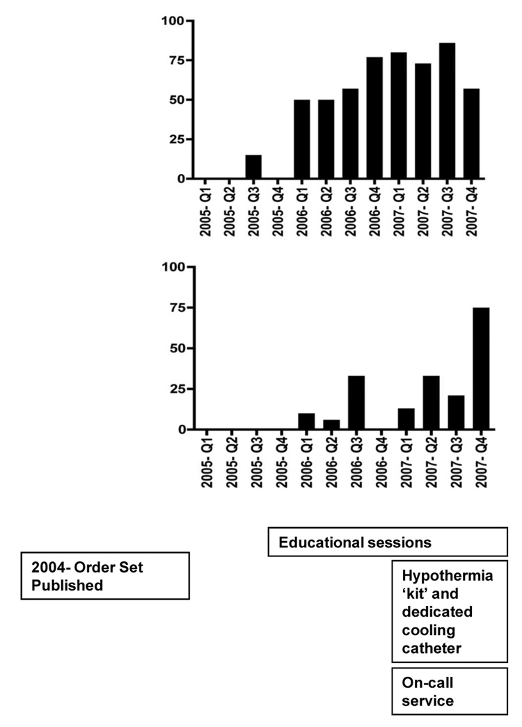 Methods and results: Linked interventions including a TH order sheet, verbal and written feedback to individual providers, an educational program, TH "kit" and on-call consultants to assist with patient care and hypothermia induction were implemented between January 1, 2005 and December 31, 2007 in a large, university-affiliated, tertiary care center. We then completed a retrospective review of all patients treated for cardiac arrest during the study period. Descriptive statistics, chi-squared analyses, or Fisher's exact test were used as appropriate. A p value <0.05 was considered significant. 135 OHCA patients and 106 IHCA patients were eligible for post-arrest care. TH use increased each year in the OHCA group (from 6% to 65% to 76%; p<0.001) and IHCA group (from 0% to 36% to 53%; p=.02). A good outcome was achieved in 21% and 8% of comatose patients with OHCA and IHCA, respectively. Patients with OHCA and ventricular dysrhythmia were more likely to have a good outcome with TH treatment than without it (good outcome in 57% vs. 8%; p=.005).