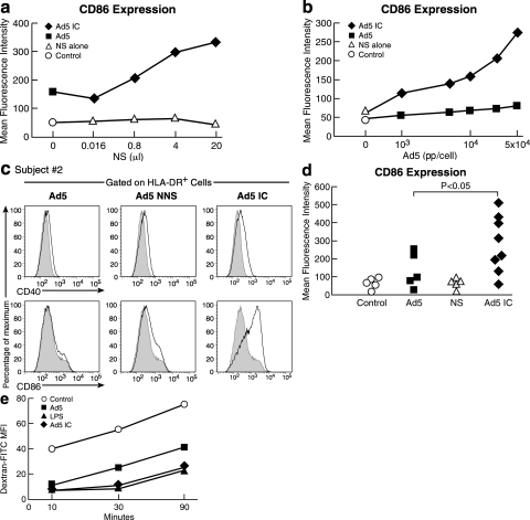 The STEP HIV vaccine trial, which evaluated a replication-defective adenovirus type 5 (Ad5) vector vaccine, was recently stopped. The reasons for this included lack of efficacy of the vaccine and a twofold increase in the incidence of HIV acquisition among vaccinated recipients with increased Ad5-neutralizing antibody titers compared with placebo recipients. To model the events that might be occurring in vivo, the effect on dendritic cells (DCs) of Ad5 vector alone or treated with neutralizing antiserum (Ad5 immune complexes [IC]) was compared. Ad5 IC induced more notable DC maturation, as indicated by increased CD86 expression, decreased endocytosis, and production of tumor necrosis factor and type I interferons. We found that DC stimulation by Ad5 IC was mediated by the Fcgamma receptor IIa and Toll-like receptor 9 interactions. DCs treated with Ad5 IC also induced significantly higher stimulation of Ad5-specific CD8 T cells equipped with cytolytic machinery. In contrast to Ad5 vectors alone, Ad5 IC caused significantly enhanced HIV infection in DC-T cell cocultures. The present results indicate that Ad5 IC activates a DC-T cell axis that, together with the possible persistence of the Ad5 vaccine in seropositive individuals, may set up a permissive environment for HIV-1 infection, which could account for the increased acquisition of HIV-1 infection among Ad5 seropositive vaccine recipients.
