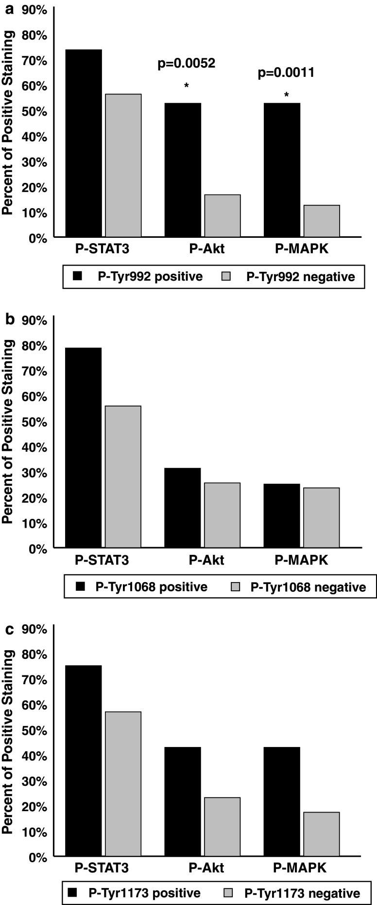 Results: We show that the phosphorylation of tyrosine residues 922 and 1173, but not 1068, are primarily affected by the activating EGFR mutations. Akt activity was significantly higher in patients with EGFR mutations but we found no difference in Stat3 or MAPK phosphorylation. Our results suggest that EGFR mutations not only increase receptor activity, but also alter responses of downstream signaling cascades in human NSCLCs and that these finding differ from results obtained in cell lines.
