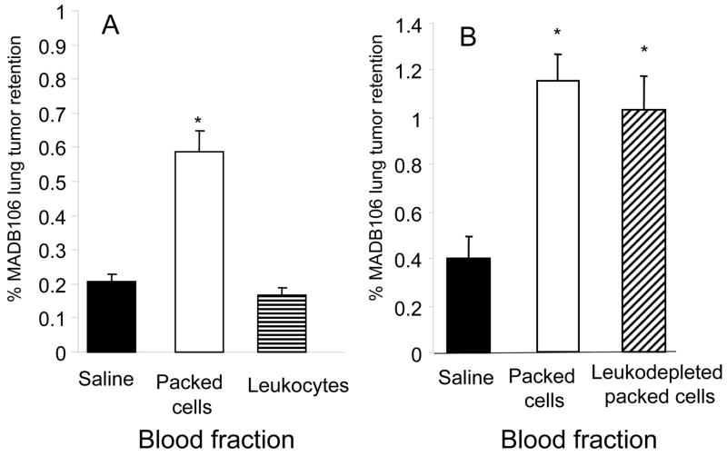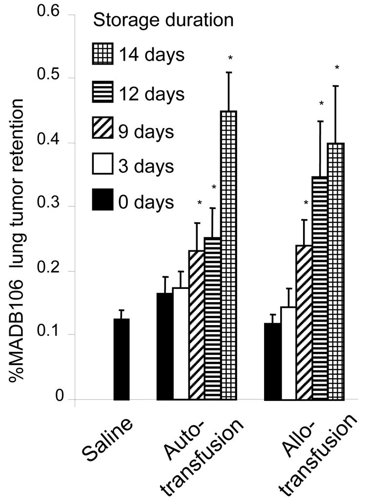 Results: Blood transfusion was found to be an independent and significant risk factor for cancer progression in both models, causing up to a fourfold increase in lung tumor retention and doubling mortality rates. Blood storage time was the critical determinant of these deleterious effects, regardless of whether the transfused blood was allogeneic or autogenic. Surprisingly, aged erythrocytes (9 days and older), rather than leukocytes or soluble factors, mediated the effects, which occurred in both operated and nonoperated animals. The effects of erythrocytes transfusion in the MADB106 model emerged immediately and dissipated within 24 h.