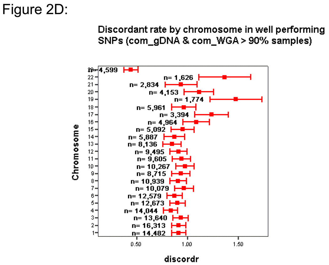 In large-scale genome-wide association studies based on high-density single nucleotide polymorphism (SNP) genotyping array, the quantity and quality of available genomic DNA (gDNA) is a practical problem. We examined the feasibility of using the Multiple Displacement Amplification (MDA) method of whole-genome amplification (WGA) for such a platform. The Affymetrix Early Access Mendel Nsp 250K GeneChip was used for genotyping 224,940 SNPs per sample for 28 DNA samples. We compared the call concordance using 14 gDNA samples and their corresponding 14 WGA samples. The overall mean genotype call rates in gDNA and the corresponding WGA samples were comparable at 97.07% [95% confidence interval (CI), 96.17-97.97] versus 97.77% (95% CI, 97.26-98.28; P = 0.154), respectively. Reproducibility of the platform, calculated as concordance in duplicate samples, was 99.45%. Overall genotypes for 97.74% (95% CI, 97.03-98.44) of SNPs were concordant between gDNA and WGA samples. When the analysis was restricted to well-performing SNPs (successful genotyping in gDNA and WGA in >90% of samples), 99.11% (95% CI, 98.80-99.42) of the SNPs, on average, were concordant, and overall a SNP showed a discordant call in 0.92% (95% CI, 0.90-0.94) of paired samples. In a pair of gDNA and WGA DNA, similar concordance was reproducible on Illumina's Infinium 610 Quad platform as well. Although copy number analysis revealed a total of seven small telomeric regions in six chromosomes with loss of copy number, the estimated genome representation was 99.29%. In conclusion, our study confirms that high-density oligonucleotide array-based genotyping can yield reproducible data and MDA-WGA DNA products can be effectively used for genome-wide SNP genotyping analysis.