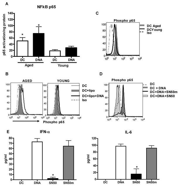 Diminished immune functions and chronic inflammation are hallmarks of aging. The underlying causes are not well understood. In this investigation, we show an increased reactivity of dendritic cells (DCs) from aged subjects to self-Ags as one of the potential mechanisms contributing to age-associated inflammation. Consistent with this, DCs from aged subjects display increased reactivity to intracellular human DNA, a self-Ag, by secreting enhanced quantities of type I IFN and IL-6 compared with the DCs from young subjects. Furthermore, this is accompanied by an increased up-regulation of costimulatory molecules CD80 and CD86. These DNA-primed DCs from aged subjects enhanced T cell proliferation compared with the young subjects, further substantiating our findings. Investigations of signaling mechanisms revealed that DNA-stimulated DCs from aged subjects displayed a significantly higher level of IFN regulatory factor-3 and NF-kappaB activity compared with their young counterparts. More importantly, DCs from aged subjects displayed a higher level of NF-kappaB activation at the basal level, suggesting an increased state of activation. This activated state of DCs may be responsible for their increased reactivity to self-Ags such as DNA, which in turn contributes to the age-associated chronic inflammation.