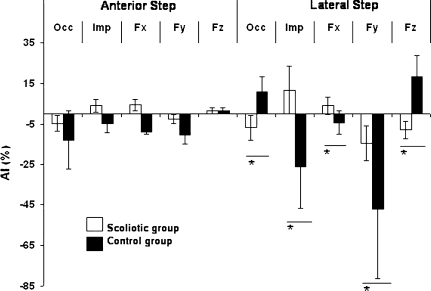 Adolescent idiopathic scoliosis (AIS) is characterized by morphological trunk modifications acting on body mass distribution. Some specific biomechanical strategies during postural regulation have been reported. Given that spinal deformity is three-dimensional, some strategy analysis resulting from different stepping directions should lead to a better understanding of the dynamic adaptation of behaviour. The aim of this study is to identify dynamic strategies of AIS patients stepping in lateral and forward directions. Ten AIS patients with a right thoracic curve and 15 controlled volunteers have been tested. Ground reaction forces (GRF) have been recorded for right-limb stepping and for left-limb stepping associated to forward and lateral directions. Force amplitudes, corresponding occurrences, impulses of stepping phases and an asymmetry index have been computed. Asymmetry and variability increased in the AIS group, compared to the control group, whatever the stepping direction is. Asymmetry for AIS patients systematically provides an increased left initiation GRF compared to a right initiation. Nevertheless, for both groups, lateral initiation shows the largest asymmetry index reported for a forward initiation. More precisely, adaptive dynamic strategies for the AIS group have been characterized by an asymmetry between right and left limbs for lateral and forward initiation. These results can be explained by the influence of scoliosis pathology on dynamic movements due to spinal deformity. A right thoracic curve leads to an extra weight on the limb, which needs to be moved; consequently, stepping initiation with the right limb was more challenging for patients than stepping with the left limb. For the AIS group, the observed variability can also depend on the ontogenesis of adaptive strategies. Lateral step initiation has to be considered as the most relevant paradigm to study scoliosis and may also serve as a clinical basis for treatment to analyse the dynamic postural control and asymmetry strategies of the scoliosis patient.