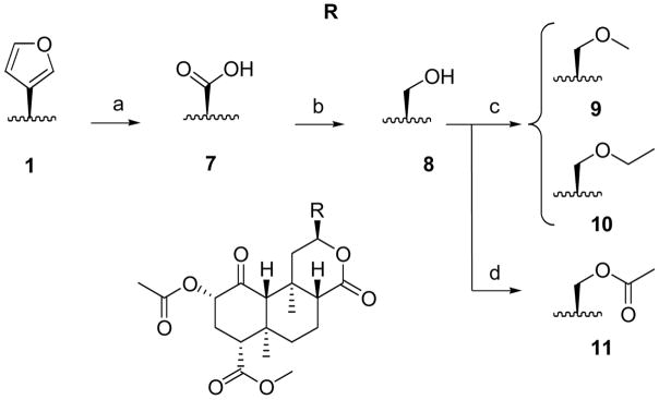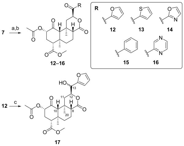 In an effort to find novel agents which selectively target the kappa opioid receptor (KOPR), we modified the furan ring of the highly potent and selective KOPR agonist salvinorin A. Introduction of small substituents at C-16 was well tolerated. 12-epi-Salvinorin A, synthesized in four steps from salvinorin A, was a selective partial agonist at the KOPR. No clear SAR patterns were observed for C-13 aryl ketones. Introducing a hydroxymethylene group between C-12 and the furan ring was tolerated. Small C-13 esters and ethers gave weak KOPR agonists, while all C-13 amides were inactive. Finally, substitution of oxadiazoles for the furan ring abolished affinity for the KOPR. None of the compounds displayed any KOPR antagonism or any affinity for mu or delta opioid receptors.