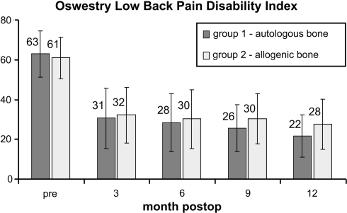 The current gold standard in lumbar fusion consists of transpedicular fixation in combination with an interbody interponate of autologous bone from iliac crest. Because of the limited availability of autologous bone as well as the still relevant donor site morbidity after iliac crest grafting the need exists for alternative grafts with a comparable outcome. Forty patients with degenerative spinal disease were treated with a monosegmental spondylodesis (ventrally, 1 PEEK-cage; dorsally, a screw and rod system), and randomly placed in two groups. In group 1, autogenous iliac crest cancellous bone was used as a cage filling. In group 2 the cages were filled with an allogenic cancellous bone graft. Following 3, 6, 9 and 12 months, the clinical outcome was determined on the basis of: the Oswestry Low Back Pain Disability Questionnaire; patient satisfaction; patient willingness to undergo the operation again; and a visual analog scale for pain. The radiological outcome was based on both fusion rate (radiographs, computed tomography), and on the bone mineral density of the grafts. After 6 months, the X-rays of the patients in group 2 had a significantly lower rate of fusion. Aside from this, there were no further significant differences. After 12 months, radiological results showed a similar fusion rate in both groups. Donor site complications consisted of five patients with hematoma, and three patients with persistent pain in group 1. No implant complications were observed. If a bone bank is available for support and accepting the low risk of possible transmission of infectious diseases, freeze-dried allogenic cancellous bone can be used for monosegmental spondylodeses. The results demonstrated an equivalent clinical outcome, as well as similar fusion rates following a 12-month period. This is in despite of a delayed consolidation process.