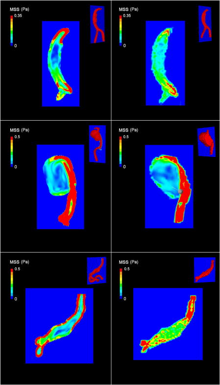 Evolution of intracranial aneurysms is known to be related to hemodynamic forces such as wall shear stress (WSS) and maximum shear stress (MSS). Estimation of these parameters can be performed using numerical simulations with computational fluid dynamics (CFD), but can also be directly measured with magnetic resonance imaging (MRI) using a time-dependent 3D phase-contrast sequence with encoding of each of the three components of the velocity vectors (7D-MRV). To study the accuracy of 7D-MRV in estimating these parameters in vivo, in comparison with CFD, 7D-MRV and patient-specific CFD modeling was performed for 3 patients who had intracranial aneurysms. Visual and quantitative analyses of the flow pattern and distribution of velocities, MSS, and WSS were performed using the two techniques. Spearman's coefficients of correlation between the two techniques were 0.56 for the velocity field, 0.48 for MSS, and 0.59 for WSS. Visual analysis and Bland-Altman plots showed good agreement for flow pattern and velocities but large discrepancies for MSS and WSS. These results indicate that 7D-MRV can be used in vivo to measure velocity flow fields and for estimating MSS and WSS. Currently, however, this method cannot accurately quantify the latter two parameters.