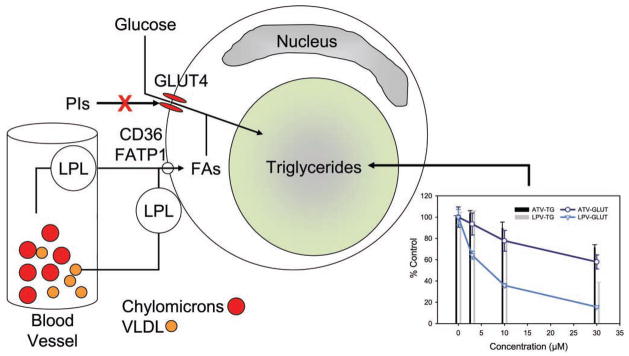 Metabolic complications associated with HIV infection and treatment frequently present as a relative lack of peripheral adipose tissue associated with dyslipidemia and insulin resistance. In this review we explain the connection between abnormalities of intermediary metabolism, observed either in vitro or in vivo, and this group of metabolic effects. We review molecular mechanisms by which the HIV protease inhibitor (PI) class of drugs may affect the normal stimulatory effect of insulin on glucose and fat storage. We then propose that both chronic inflammation from HIV infection and treatment with some drugs in this class trigger cellular homeostatic stress responses with adverse effects on intermediary metabolism. The physiologic outcome is such that total adipocyte storage capacity is decreased, and the remaining adipocytes resist further fat storage. The excess circulating and dietary lipid metabolites, normally "absorbed" by adipose tissue, are deposited ectopically in lean (muscle and liver) tissue, where they impair insulin action. This process leads to a pathologic cycle of lipotoxicity and lipoatrophy and a clinical phenotype of body fat distribution with elevated waist-to-hip ratio similar to the metabolic syndrome.