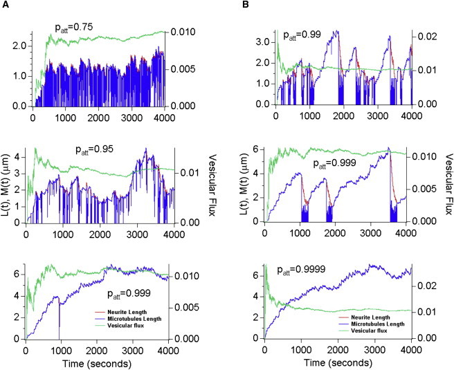 Neurite growth is a fundamental process of neuronal development, which requires both membrane expansions by exocytosis and cytoskeletal dynamics. However, the specific contribution of these processes has not been yet assessed quantitatively. To study and quantify the growth process, we construct a biophysical model in which we relate the overall neurite outgrowth rate to the vesicle dynamics. By considering the complex motion of vesicles in the cell soma, we demonstrate from biophysical consideration that the main step of finding the neurite initiation site relies mainly on a two-dimensional diffusion/sequestration/fusion at the cell surface and we obtain a novel formula for the flux of vesicles at the neurite base. In the absence of microtubules, we show that a nascent neurite initiated by vesicular delivery can only reach a small length. By adding the microtubule dynamics to the secretory pathway and using stochastic analysis and simulations, we study the complex dynamics of neurite growth. Within this model, depending on the coupling parameter between the microtubules and the neurite, we find different regimes of growth, which describe dendritic and axonal growth. To validate one aspect of our model, we demonstrate that the experimental flux of TI-VAMP but not Synaptobrevin 2 vesicles contributes to the neurite growth. We conclude that although vesicles can be generated randomly in the cell body, the search for the neurite position using the microtubule network and diffusion is quite fast. Furthermore, when the TI-VAMP vesicular flow is large enough, the interactions between the microtubule bundle and the neurite control the growth process. In addition, all of these processes intimately cooperate to mediate the various modes of neurite growth: the model predicts three different growing modes including, in addition to the stable axonal growth and the stochastic dendritic growth, a fast oscillatory regime. Finally our study demonstrates that cytoskeletal dynamics is necessary to generate long protrusion, while vesicular delivery alone can only generate small neurite.