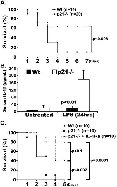 Significant morbidity and mortality can be attributed to inflammatory diseases; therefore, a greater understanding of the mechanisms involved in the progression of inflammation is crucial. Here, we demonstrate that p21((WAF1/CIP1)), an established suppressor of cell cycle progression, is a inhibitor of IL-1beta synthesis in macrophages. Mice deficient in p21 (p21(-/-)) display increased susceptibility to endotoxic shock, which is associated with increased serum levels of IL-1beta. Administration of IL-1 receptor antagonist reduces LPS-induced lethality in p21(-/-) mice. Analysis of isolated macrophages, which are one of the central producers of IL-1beta, reveals that deficiency for p21 led to more IL-1beta mRNA and pro-protein synthesis following TLR ligation. The increase in IL-1beta pro-protein is associated with elevated secretion of active IL-1beta by p21(-/-) macrophages. siRNA-mediated knockdown of p21 in human macrophages results in increased IL-1beta secretion as well. A peptide mapping strategy shows that the cyclin-dependent-kinase (CDK)-binding domain of p21 is sufficient to reduce the secretion of IL-1beta by p21(-/-) macrophages. These data suggest a novel role for p21 and specifically for the CDK-binding domain of p21((WAF1/CIP1)) in inhibiting inflammation.