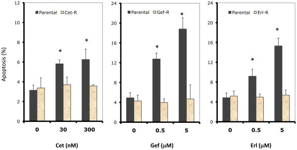 Experimental design: To develop cell lines with acquired resistance to EGFR inhibitors we utilized the human head and neck squamous cell carcinoma tumor cell line SCC-1. Cells were treated with increasing concentrations of cetuximab, gefitinib, or erlotinib, and characterized for the molecular changes in the EGFR inhibitor-resistant lines relative to the EGFR inhibitor-sensitive lines.