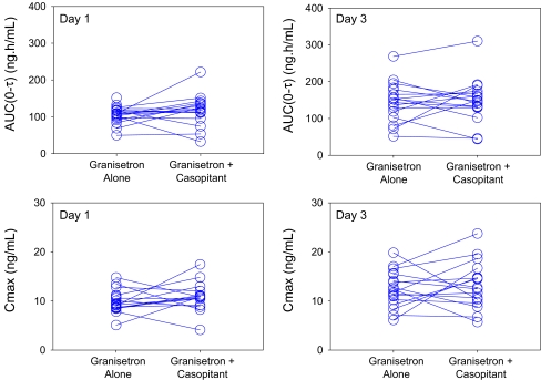 Results: The largest changes in hydrodolasetron exposure after coadministration with casopitant were seen in CYP2D6 EMs, with a 24% increase in hydrodolasetron AUC on day 1 and 30% increase in Cmax on days 1 and 3. All other changes in hydrodolasetron exposure were <20%, and granisetron exposure was not altered to any relevant extent (<11%).