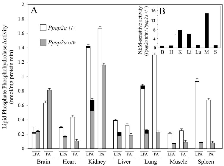 LPA (lysophosphatidic acid) is a lipid mediator that stimulates cell proliferation and growth, and is involved in physiological and pathological processes such as wound healing, platelet activation, angiogenesis and the growth of tumours. Therefore defining the mechanisms of LPA production and degradation are of interest in understanding the regulation of these processes. Extracellular LPA synthesis is relatively well understood, whereas the mechanisms of its degradation are not. One route of LPA degradation is dephosphorylation. A candidate enzyme is the integral membrane exophosphatase LPP1 (lipid phosphate phosphohydrolase type 1). In the present paper, we report the development of a mouse wherein the LPP1 gene (Ppap2a) was disrupted. The homozygous mice, which are phenotypically unremarkable, generally lack Ppap2a mRNA, and multiple tissues exhibit a substantial (35-95%) reduction in LPA phosphatase activity. Compared with wild-type littermates, Ppap2a(tr/tr) animals have increased levels of plasma LPA, and LPA injected intravenously is metabolized at a 4-fold lower rate. Our results demonstrate that LPA is rapidly metabolized in the bloodstream and that LPP1 is an important determinant of this turnover. These results indicate that LPP1 is a catabolic enzyme for LPA in vivo.