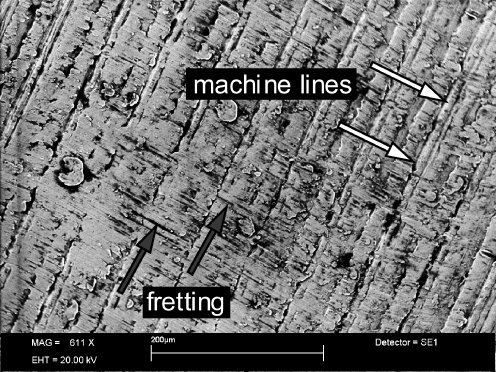 Dans les prothèses totales de hanche l’utilisation d’implants avec col modulaire est d’une utilisation fréquente et pratique. Néanmoins, cette utilisation laisse persister des doutes sur la stabilité mécanique et sur le relargage des ions métalliques. 5 différents implants ont été étudiés en reproduisant les conditions in vivo, en mesurant le relargage de titane et en évaluant la corrosion et les lésions du col. Ce travail n’a pas permis de mettre en évidence d’échec secondaire à une corrosion excessive, et les taux de titane sont restés extrêmement bas dans les limites de l’acceptable.