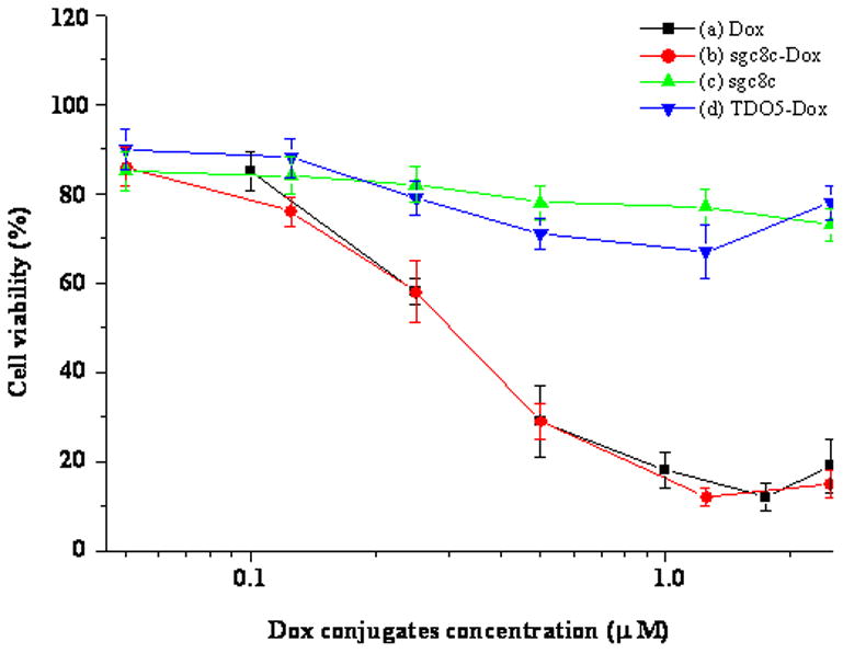 The conjugation of antitumor drugs to targeting reagents such as antibodies is a promising method that can increase the efficacy of chemotherapy and reduce the overall toxicity of the drugs. In this study, we covalently link the antitumor agent doxorubicin (Dox) to the DNA aptamer sgc8c, which was selected by the cell-SELEX method. In doing so, we expected that this sgc8c-Dox conjugate would specifically kill the target CCRF-CEM (T-cell acute lymphoblastic leukemia, T-cell ALL) cells, but with minimal toxicity towards nontarget cells. The results demonstrated that the sgc8c-Dox conjugate possesses many of the properties of the sgc8c aptamer, including high binding affinity (K(d)=2.0+/-0.2 nM) and the capability to be efficiently internalized by target cells. Moreover, due to the specific conjugation method, the acid-labile linkage connecting the sgc8c-Dox conjugate can be cleaved inside the acidic endosomal environment. Cell viability tests demonstrate that the sgc8c-Dox conjugates not only possess potency similar to unconjugated Dox, but also have the required molecular specificity that is lacking in most current targeted drug delivery strategies. Furthermore, we found that nonspecific uptake of membrane-permeable Dox to nontarget cell lines could also be inhibited by linking the drug with the aptamer; thus, the conjugates are selective for cells that express higher amounts of target proteins. Compared to the less effective Dox-immunoconjugates, these sgc8c-Dox conjugates make targeted chemotherapy more feasible with drugs having various potencies. When combined with the large number of recently created DNA aptamers that specifically target a wide variety of cancer cells, this drug-aptoconjugation method will have broad implications for targeted drug delivery.