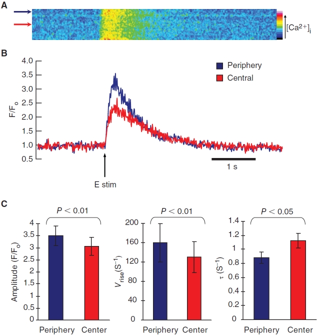 Mouse (m) and human embryonic stem cell-derived cardiomyocytes (hESC-CMs) are known to exhibit immature Ca(2+) dynamics such as small whole-cell peak amplitude and slower kinetics relative to those of adult. In this study, we examined the maturity and efficiency of Ca(2+)-induced Ca(2+) release in m and hESC-CMs, the presence of transverse (t) tubules and its effects on the regional Ca(2+) dynamics. In m and hESC-CMs, fluorescent staining and atomic force microscopy (AFM) were used to detect the presence of t-tubules, caveolin-3, amphiphysin-2 and colocalization of dihydropyridine receptors (DHPRs) and ryanodine receptors (RyRs). To avoid ambiguities, regional electrically-stimulated Ca(2+) dynamics of single ESC-CMs, rather than spontaneously beating clusters, were measured using confocal microscopy. m and hESC-CMs showed absence of dyads, with neither t-tubules nor colocalization of DHPRs and RyRs. Caveolin-3 and amphiphysin-2, crucial for the biogenesis of t-tubules with robust expression in adult CMs, were also absent. Single m and hESC-CMs displayed non-uniform Ca(2+) dynamics across the cell that is typical of CMs deficient of t-tubules. Local Ca(2+) transients exhibited greater peak amplitude at the peripheral than at the central region for m (3.50 +/- 0.42 vs. 3.05 +/- 0.38) and hESC-CMs (2.96 +/- 0.25 vs. 2.72 +/- 0.25). Kinetically, both the rates of rise to peak amplitude and transient decay were faster for the peripheral relative to the central region. Immature m and hESC-CMs display unsynchronized Ca(2+) transients due to the absence of t-tubules and gene products crucial for their biogenesis. Our results provide insights for driving the maturation of ESC-CMs.