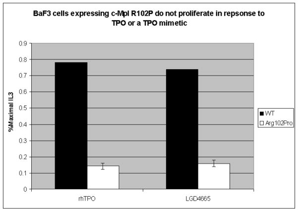 Results: Data from cell-line models indicate that c-Mpl R102P does not support significant signaling in response to thrombopoietin due to impaired trafficking of the mutant receptor to the cell surface. Alternative thrombopoietic agents do not circumvent this block to signaling, likely due to the inaccessibility of the receptor. In addition, previous data indicate that c-Mpl 541Stop does not support intracellular signaling due to the loss of critical intracellular domains.