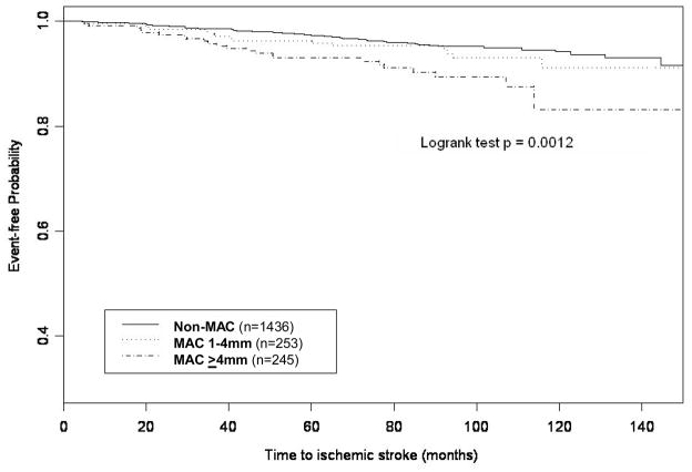 Methods: The study cohort consisted of 1,955 subjects, ages >or=40 years, and free of prior myocardial infarction (MI) and ischemic stroke (IS). Mitral annular calcification was assessed by transthoracic 2-dimensional echocardiography. The association between MAC and MI, IS, and vascular death (VD) was examined by Cox proportional hazard models with adjustment for established cardiovascular risk factors. The effect of MAC thickness was also analyzed.