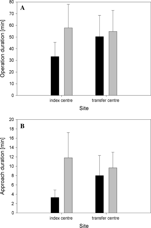A Prospective randomised controlled study was done to determine statistical difference between the standard microsurgical discotomy (MC) and a minimally invasive microscopic procedure for disc prolapse surgery by comparing operation duration and clinical outcome. Additionally, the transferability of the results was determined by a bicentric design. The microscopic assisted percutaneous nucleotomy (MAPN) has been advocated as a minimally invasive tubular technique. Proponents have claimed that minimally invasive procedures reduce postoperative pain and accelerate the recovery. In addition, there exist only a limited number of well-designed comparison studies comparing standard microdiscotomy to a tubular minimally invasive technique that support this claim. Furthermore, there are no well-designed studies looking at the transferability of those results and possible learning curve phenomena. We studied 100 patients, who were planned for disc prolapse surgery at two centres [50 patients at the developing centre (index) and 50 patients at the less experienced (transfer) centre]. The randomisation was done separately for each centre, employing a block-randomisation procedure with respect to age and preoperative Oswestry score. Operation duration was chosen as a primary outcome parameter as there was a distinguished shortening observed in a preliminary study at the index centre enabling a sound case number estimation. The following data were compared between the two groups and the centres with a 12-month follow-up: surgical times (operation duration and approach duration), the clinical results, leg and back pain by visual analogue scale, the Oswestry disability index, length of hospital stay, return to work time, and complications. The operation duration was statistically identical for MC (57.8 +/- 20.2 min) at the index centre and for MAPN (50.3 +/- 18.3 min) and MC (54.7 +/- 18.1 min) at the transfer centre. The operation duration was only significantly shorter for the MAPN technique at the index centre with 33.3 min (SD 12.1 min). There was a huge clinical improvement for all patients regardless of centre or method revealed by a repeated measures ANOVA for all follow-up visits Separate post hoc ANOVAs for each centre revealed that there was a significant time-method (MAPN vs. MC) interaction at the index centre (F = 3.75, P = 0.006), whereas this crucial interaction was not present at the transfer centre (F = 0.5, P = 0.7). These results suggest a slightly faster clinical recovery for the MAPN patients only at the index centre. This was due to a greater reduction in VAS score for back pain at discharge, 8-week and 6-month follow up (P < 0.002). The Oswestry-disability scores reached a significant improvement compared to the initial values extending over the complete follow-up at both centres for both methods without revealing any differences for the two methods in either centre. There was no difference regarding complications. The results demonstrate that a shorter operation duration and concomitant quicker recovery is comprehensible at an experienced minimally invasively operating centre. These advantages could not be found at the transfer centre within 25 minimally invasive procedures. In conclusion both procedures show equal mid term clinical results and the same complication rate even if the suggested advantages for the minimally invasive procedure could not be confirmed for the transfer centre within the framework of this study.