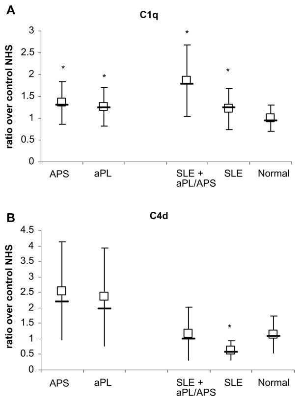 Complement plays a major role in inflammation and thrombosis associated with systemic lupus erythematosus (SLE) and the antiphospholipid syndrome (APS). A cross-sectional retrospective analysis was performed to evaluate serum complement fixation on platelets and thrombotic incidence using banked sera and clinical data from patients with SLE (n = 91), SLE with antiphospholipid antibodies (aPL) or APS (n = 78) and primary aPL (n = 57) or APS (n = 96). In-situ complement fixation was measured as C1q and C4d deposition on heterologous platelets using an enzyme-linked immunosorbent assay approach. Platelet activation by patient serum in the fluid phase was assessed via serotonin release assay. Enhanced in-situ complement fixation was associated with the presence of IgG aPL and IgG anti-beta2 glycoprotein 1 antibodies (P < 0.05) and increased platelet activation (P < 0.005). Moreover, enhanced complement fixation, especially C4d deposition on heterologous platelets, was positively associated with arterial thrombotic events in patients with SLE and aPL (P = 0.039). Sera from patients with aPL possess an enhanced capacity for in-situ complement fixation on platelets. This capacity may influence arterial thrombosis risk in patients with SLE.
