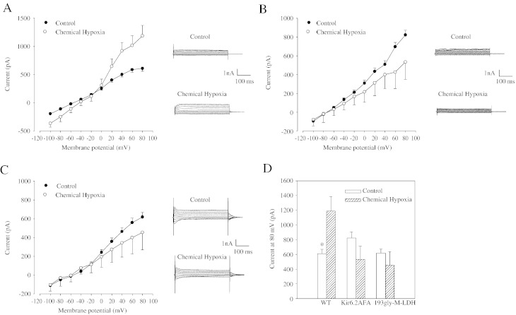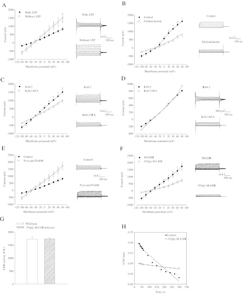 Muscle form of lactate dehydrogenase (M-LDH), a minor LDH form in cardiomyocytes, physically interacts with ATP-sensitive K+ (K ATP) channel-forming subunits. Here, we have shown that expression of 193gly-M-LDH, an inactive mutant of M-LDH, inhibit regulation of the K ATP channels activity by LDH substrates in embryonic rat heart H9C2 cells. In cells expressing 193gly-M-LDH chemical hypoxia has failed to activate K ATP channels. The similar results were obtained in H9C2 cells expressing Kir6.2AFA, a mutant form of Kir6.2 with largely decreased K+ conductance. Kir6.2AFA has slightly, but significantly, reduced cellular survival under chemical hypoxia while the deleterious effect of 193gly-M-LDH was significantly more pronounced. The levels of total and subsarcolemmal ATP in H9C2 cells were not affected by Kir6.2AFA, but the expression of 193gly-M-LDH led to lower levels of subsarcolemmal ATP during chemical hypoxia. We conclude that M-LDH regulates both the channel activity and the levels of subsarcolemmal ATP and that both mechanism contribute to the M-LDH-mediated cytoprotection.