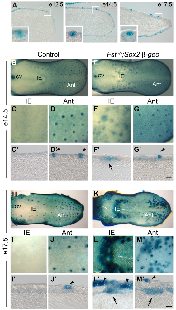 The regenerative capacity of many placode-derived epithelial structures makes them of interest for understanding the molecular control of epithelial stem cells and their niches. Here, we investigate the interaction between the developing epithelium and its surrounding mesenchyme in one such system, the taste papillae and sensory taste buds of the mouse tongue. We identify follistatin (FST) as a mesenchymal factor that controls size, patterning and gustatory cell differentiation in developing taste papillae. FST limits expansion and differentiation of Sox2-expressing taste progenitor cells and negatively regulates the development of taste papillae in the lingual epithelium: in Fst(-/-) tongue, there is both ectopic development of Sox2-expressing taste progenitors and accelerated differentiation of gustatory cells. Loss of Fst leads to elevated activity and increased expression of epithelial Bmp7; the latter effect is consistent with BMP7 positive autoregulation, a phenomenon we demonstrate directly. We show that FST and BMP7 influence the activity and expression of other signaling systems that play important roles in the development of taste papillae and taste buds. In addition, using computational modeling, we show how aberrations in taste papillae patterning in Fst(-/-) mice could result from disruption of an FST-BMP7 regulatory circuit that normally suppresses noise in a process based on diffusion-driven instability. Because inactivation of Bmp7 rescues many of the defects observed in Fst(-/-) tongue, we conclude that interactions between mesenchyme-derived FST and epithelial BMP7 play a central role in the morphogenesis, innervation and maintenance of taste buds and their stem/progenitor cells.