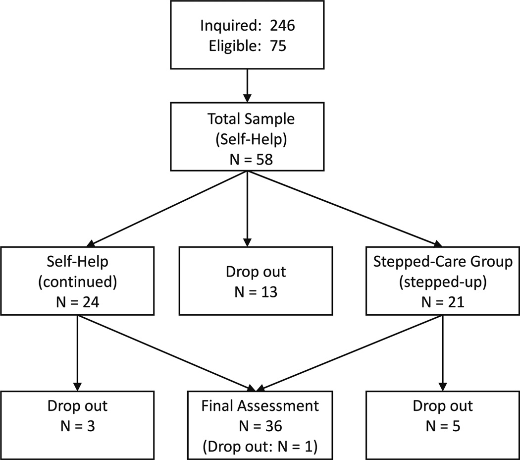 In a stepped-care approach to treatment, patients are transitioned to more intensive treatments when less intensive treatments fail to meet treatment goals. Self-help programs are recommended as an initial, low intensity treatment phase in stepped-care models. This investigation examined the effectiveness of a self-help, stepped-care weight loss program. Fifty-eight overweight/obese adults (BMI ≥27 kg/m(2)) participated in a weight loss program. Participants were predominately Caucasian (93.1%) and female (89.7%) with a mean BMI of 36.6 (SD=7.1). Of those completing the program, 57% of participants (N=21) who remained in self-help maintained an 8% weight loss at follow-up. Participants who were stepped-up self-monitored fewer days and reported higher daily caloric intake than self-help participants. Once stepped-up, weight loss outcomes were equivalent between individuals who remained in self-help compared to those who were stepped-up. Individuals who were stepped-up benefited from early intensive intervention when unsuccessful at losing weight with self-help.