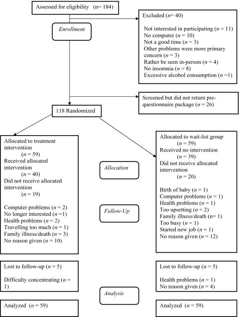 Measurement and results: From pre- to post-treatment, there was a 33% attrition rate, and attrition was related to referral status (i.e., dropouts were more likely to have been referred for treatment rather than recruited from the community). Using a mixed model analysis of variance procedure (ANOVA), results showed that online treatment produced statistically significant improvements in the primary end points of sleep quality, insomnia severity, and daytime fatigue. Online treatment also produced significant changes in process variables of pre-sleep cognitive arousal and dysfunctional beliefs about sleep.