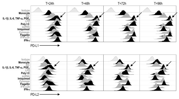 Discussion: These findings suggest that, in monocyte-derived DCs, additional strategies than PD-L1 or PD-L2 blockade will be needed to improve the function of PD-1 high T cells.