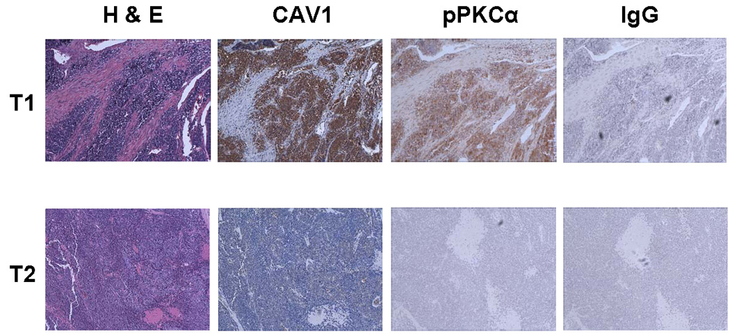 Caveolin-1 (CAV1) has been implicated in the regulation of several signaling pathways and in oncogenesis. Previously, we identified CAV1 as a key determinant of the oncogenic phenotype and tumorigenic activity of cells from tumors of the Ewing's Sarcoma Family (ESFT). However, the possible CAV1 involvement in the chemotherapy resistance commonly presented by an ESFT subset has not been established to date. This report shows that CAV1 expression determines the sensitivity of ESFT cells to clinically relevant chemotherapeutic agents. Analyses of endogenous CAV1 levels in several ESFT cells and ectopic CAV1 expression into ESFT cells expressing low endogenous CAV1 showed that the higher the CAV1 levels, the greater their resistance to drug treatment. Moreover, results from antisense- and shRNA-mediated gene expression knockdown and protein re-expression experiments demonstrated that CAV1 increases the resistance of ESFT cells to doxorubicin (Dox)- and cisplatin (Cp)-induced apoptosis by a mechanism involving the activating phosphorylation of PKCalpha. CAV1 knockdown in ESFT cells led to decreased phospho(Thr(638))-PKCalpha levels and a concomitant sensitization to apoptosis, which were reversed by CAV1 re-expression. These results were recapitulated by PKCalpha knockdown and re-expression in ESFT cells in which CAV1 was previously knocked down, thus demonstrating that phospho(Thr(638))-PKCalpha acts downstream of CAV1 to determine the sensitivity of ESFT cells to chemotherapeutic drugs. These data, along with the finding that CAV1 and phospho(Thr(638))-PKCalpha are co-expressed in approximately 45% of ESFT specimens tested, imply that targeting CAV1 and/or PKCalpha may allow the development of new molecular therapeutic strategies to improve the treatment outcome for patients with ESFT.