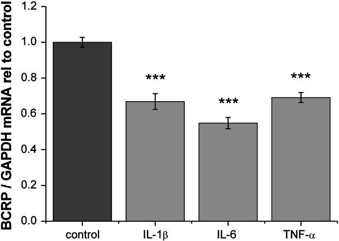 Brain capillary endothelial cells form the blood-brain barrier (BBB), a highly selective permeability membrane between the blood and the brain. Besides tight junctions that prevent small hydrophilic compounds from passive diffusion into the brain tissue, the endothelial cells express different families of drug efflux transport proteins that limit the amount of substances penetrating the brain. Two prominent efflux transporters are the breast cancer resistance protein and P-glycoprotein (P-gp). During inflammatory reactions, which can be associated with an altered BBB, pro-inflammatory cytokines are present in the systemic circulation. We, therefore, investigated the effect of the pro-inflammatory cytokines interleukin-1beta (IL-1beta), interleukin-6 (IL-6) and tumor necrosis factor-alpha (TNF-alpha) on the expression and activity of BCRP and P-gp in the human hCMEC/D3 cell line. BCRP mRNA levels were significantly reduced by IL-1beta, IL-6 and TNF-alpha. The strongest BCRP suppression at the protein level was observed after IL-1beta treatment. IL-1beta, IL-6 and TNF-alpha also significantly reduced the BCRP activity as assessed by mitoxantrone uptake experiments. P-gp mRNA levels were slightly reduced by IL-6, but significantly increased after TNF-alpha treatment. TNF-alpha also increased protein expression of P-gp but the uptake of the P-gp substrate rhodamine 123 was not affected by any of the cytokines. This in vitro study indicates that expression levels and activity of BCRP, and P-gp at the BBB may be altered by acute inflammation, possibly affecting the penetration of their substrates into the brain.