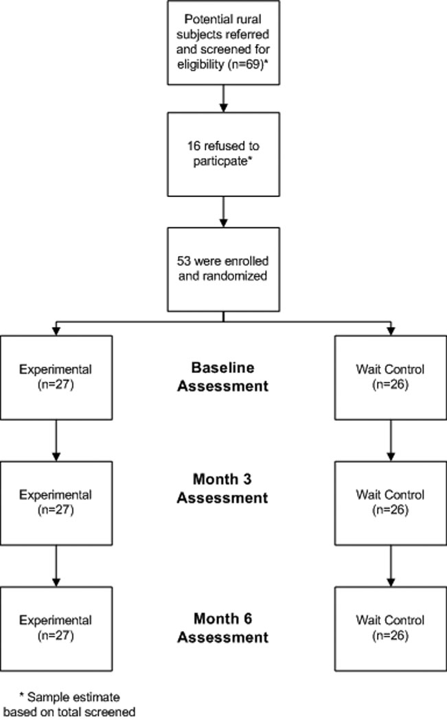 Although most cancer survivors are at risk for being lost in the transition from treatment to survivorship, rural breast cancer survivors face special challenges that might place them at particular risk. This small-scale preliminary study had 2 specific aims: (aim 1) establish the feasibility of rural breast cancer survivors participation in a longitudinal quality of life (QOL) intervention trial and (aim 2) determine the effects of the Breast Cancer Education Intervention (BCEI) on overall QOL. Fifty-three rural breast cancer survivors were randomized to either an experimental (n = 27) or a wait-control arm (n = 26). Participants in the experimental arm received the BCEI consisting of 3 face-to-face education and support sessions and 2 face-to-face and 3 telephone follow-up sessions, along with supplemental written and audiotape materials over a 6-month period. Breast Cancer Education Intervention modules and interventions are organized within a QOL framework. To address the possible effects of attention, wait-control participants received 3 face-to-face sessions and 3 telephone sessions during the first 6 months of participation in the study, but not the BCEI intervention. Research questions addressing aim 1 were as follows: (a) can rural breast cancer survivors be recruited into a longitudinal intervention trial, and (b) can their participation be retained. Research questions for aim 2 were as follows: (a) do participants who received the BCEI show improvement in overall QOL, and (b) is the QOL improvement sustained over time. Data were analyzed using repeated-measures general linear mixed models. Results demonstrated the ability to recruit and retain 53 rural breast cancer survivors, that the experimental arm showed improvement in overall QOL (P = .013), and that there were significant differences in overall QOL between the experimental and wait-control groups at both months 3 and 6. Thus, it appears that at least some rural breast cancer survivors can and will participate in a larger trial and will maintain their participation and that those that do participate experience significant QOL benefit.